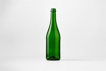 The bottles are robust and weigh almost 650 grams, giving your product a quality feel and appearance. There is a 31mm punt in the base and the top takes a standard champagne cork or 29mm crown cap.