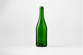 A full pallet of green glass champagne bottles in the standard style, with sloped shoulders and 750ml capacity.