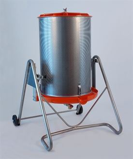 - Mounted on a wheeled, tilting framework to allow easy discharge of pressed matter and easy manoeuvring in the winery